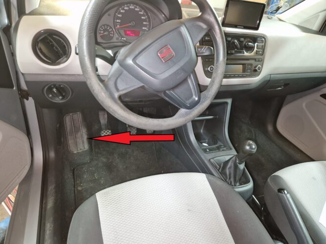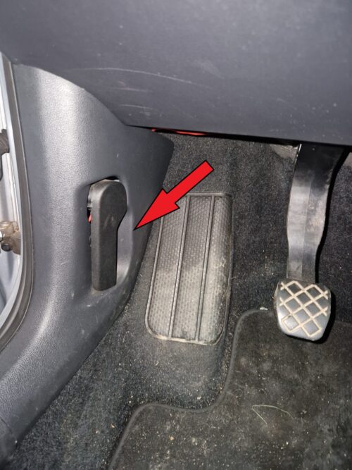 - Find det indvendige frigørelseshåndtag: Åbn først førerdøren og kig ned ved siden af dit sæde. Du vil finde et indvendigt håndtag placeret nær foden af førersædet. Dette håndtag bruges til at frigøre motorhjelmen.
